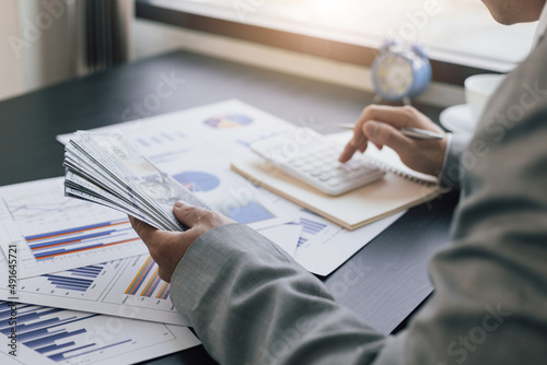 Businessman counting money using calculator to calculate company accounting, income, taxes, expenses and profit. Accounting concepts and financial planning for retirement.