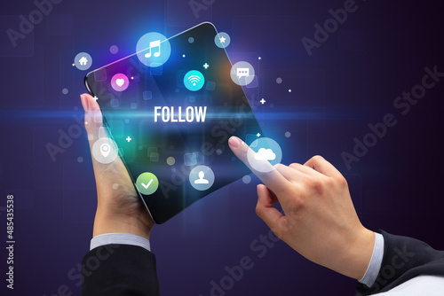 follow, smart, multimedia, social network, social, communication, hand, online, media, concept, young, lifestyle, web, contact, cyberspace, messaging, app, flex, prototype, folded, futuristic, mobile phone, display, mobile, phone, flexible, curved, modern, elastic, unfold, innovation, cellular, touch, touch screen, screen, mobile phone, phone, future, device, smartphone, contraption, foldable