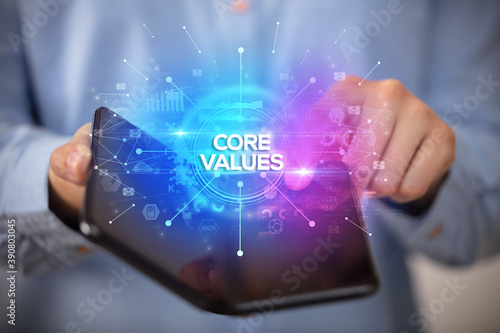 Businessman holding a foldable smartphone with CORE VALUES inscription, new business concept