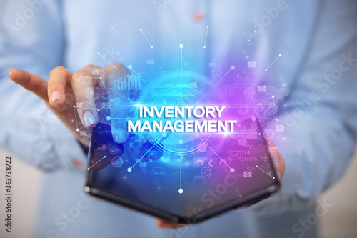 Businessman holding a foldable smartphone with INVENTORY MANAGEMENT inscription, new business concept