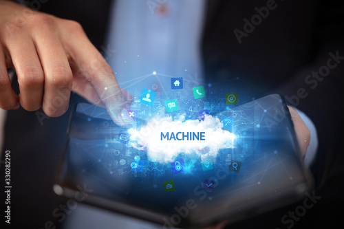 Businessman holding a foldable smartphone with MACHINE inscription, technology concept