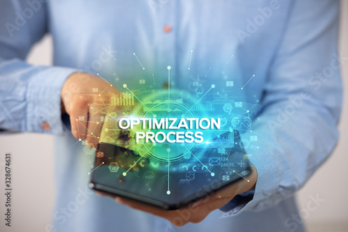 Businessman holding a foldable smartphone with OPTIMIZATION PROCESS inscription, new business concept