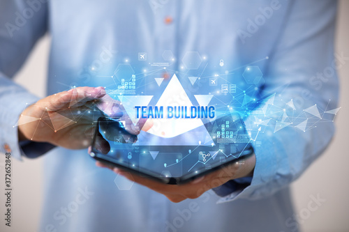 Businessman holding a foldable smartphone with TEAM BUILDING inscription, business concept