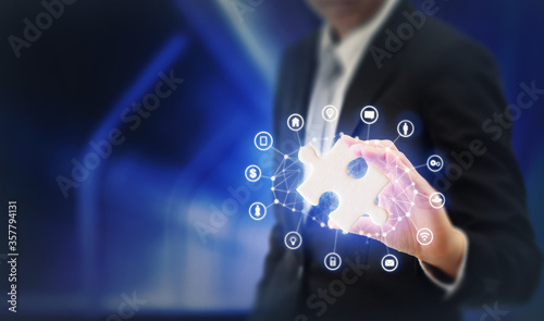 Businessman holding a glowing white jigsaw puzzle with graphic network icons on technology blue background; Find the right solution for the work job concept