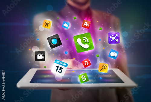 tablet, signs, symbol, icon, element, speech, bubble, aeroplane, cloud, colours, colourful, music, note, tech, technology, media, multimedia, phone, money, dollar, background, screen, modern, business, communication, web, cyberspace, device, icon, signs, symbol, digital, man, male, caucasian, businessman, hold, holding, presenting, showing, presentation, hand, boy, young, various, collection, set