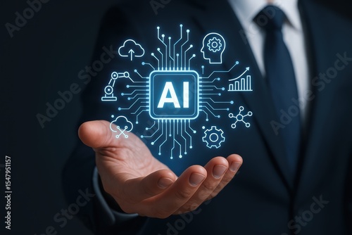 Businessman holding glowing AI technology circuit diagram with icons