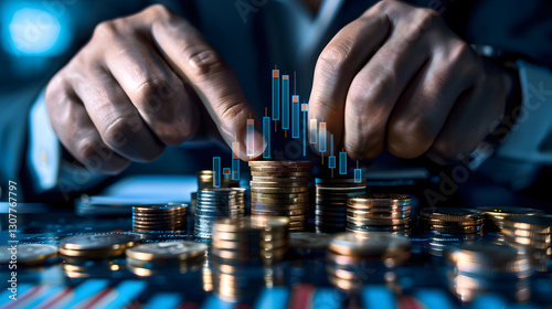 Businessman Holding Stacked Coins with Rising Financial Graph