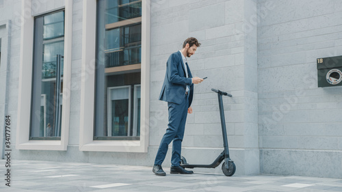 Businessman in a Suit is Activating an Electric Scooter with a Smartphone. He's Scaning the QR Code. Modern Entrepreneur Uses Contemporary Ecological Transport to Go on an Office Meeting.