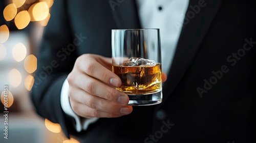 Businessman in black suit holding glass of whiskey Celebrate company success close-up with generaative ai