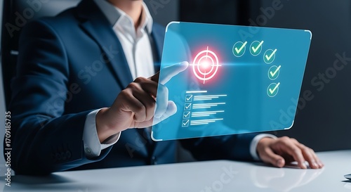 business, technology, interface, achievement, goal, success, strategy, planning, project, management, progress, target, checklist, control, approval, tick, mark, complete, done, task, verification, validation, concept, digital, screen, touch, hand, pointing, modern, future, innovation, presentation, office, workspace, executive, professional, corporate, suit, formal, visualisation, datum, information, analysis, communication, network, transparent, smart, meeting, idea