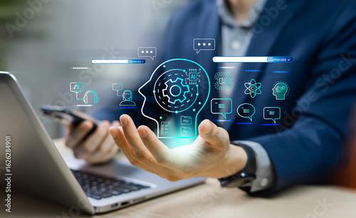 Businessman interacting with AI chatbots to create content through commands. Concept of artificial intelligence, future technology, and human AI collaboration in digital innovation.