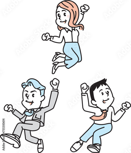 illustration, people, woman, man, smile, sweet, lively, exercise, fun, japanese, pose, young, businessman, jump, suit, rejoice, spring, joyful, employee, set, vector