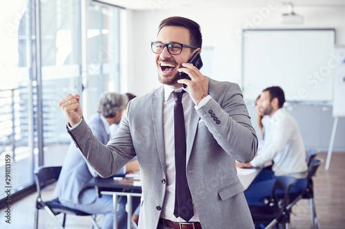 person, businessman, office, business, man, corporate, professional, adult, meeting, group, mobile, phone, communication, cyberspace, mobile phone, happy, celebrate, goal, success, mobile phone, using, device, holding, phone, smartphone, smart, caucasian, young, confidence, teamwork, computer, male, executive, team, work, manager, discussion, working, colleague, job, suit, company, successful, technology, cooperation, businessperson, workplace, presentation, leader