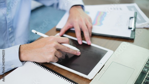 Businessman or manager taps tablet embracing the world of technology and internet focus on finance searching for information online from corporate matters to marketing strategies. In his modern office
