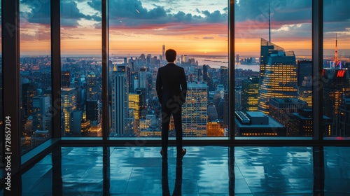 businessman, city landscape, sunset, contemplation, skyline, dusk, corporate, leadership, strategy, decision, silhouette, urban, executive, professional, city life, modern, panoramic view, skyscraper, highrise, metropolitan, business district, glass window, evening, golden hour