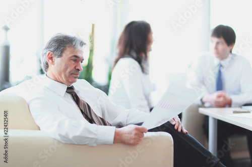businessman pondering a document sitting in a modern office