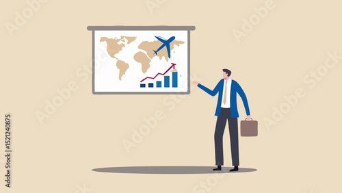 Businessman presenting global growth chart with airplane on world map in a presentation board