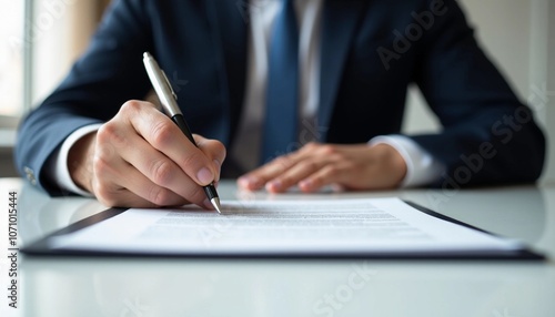 Businessman Signing Official Document with Pen on Desk