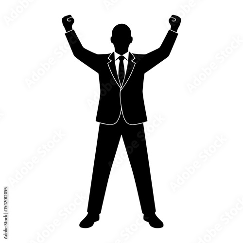 businessman, silhouette, success, celebration, achievement, victory, corporate, professional, winning, pose, attaching, suit, arm, raised, man, standing, black, white, leader, executive, career, job, work, office, formal, wear, person, male, adult, business, triumph, winner, gesture, up, isolated, figure, icon, symbol, design, illustration, vector, art, shape, with