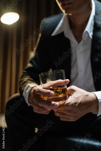 Businessman sitting Holding a Glass of Whiskey Drink Whiskey in the liquor store room