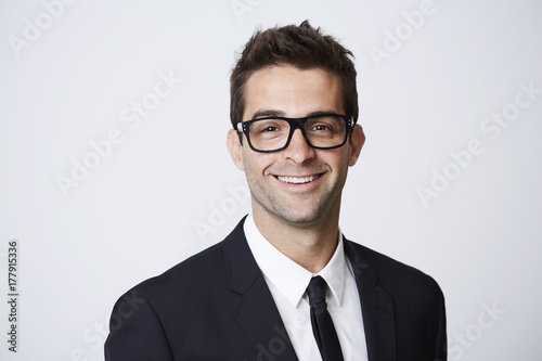 horizontal, color image, photo, one person, indoor, studio shot, stubble field, photogenic, suit, front view, businessman, business, white background, attaching, portrait, black, confidence, eyeglass
