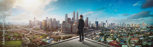 Businessman stand at rooftop looking great cityscape view and thinking business plan of the future .
