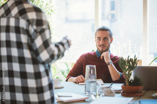 at work, beard, blond, business, businessman, businessperson, businesswoman, caucasian, co-worker, collaborate, colleague, company, conference, desk, explain, green, greenery, photogenic, horizontal, indoor, lecturer, man, modern, office, people, plant, pot, presentation, presenter, professional, seminar, serious, to sit, racked, table, teacher, team, teamwork, trainer, training, 2, white, woman, work, young, backview, male, person, adult, adult, 20s, young adult, young adult, young person, grown-up, girl, female, teenage, teenage, young people, teenage, youth, youth, minor, juvenile, juvenile, teenage, teenage, youngster, youngster