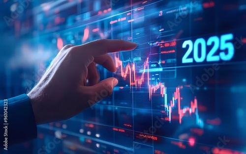 Businessman touching a virtual screen with a rising graph and the text "2025" on a transparent background