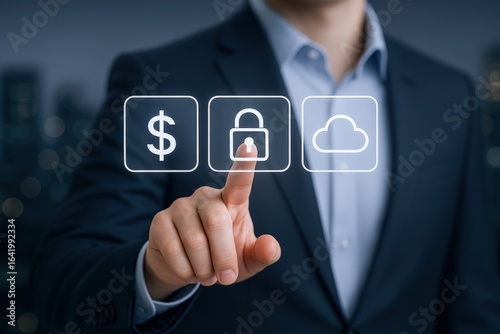 Businessman touching virtual interface icons: Money, lock and cloud. Representing business, security and modern technology