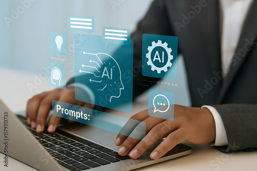 Businessman Typing AI Prompts on Virtual Interface Typing AI Commands for Business Productivity