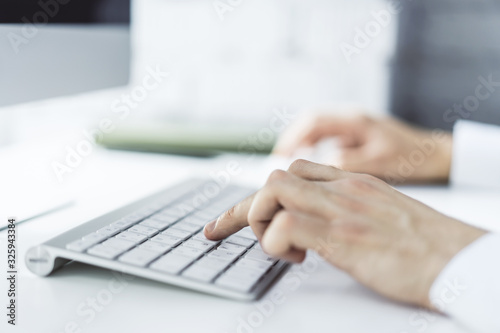 Businessman typing on computer keyboard in sunny office, business and technology concept. Close up