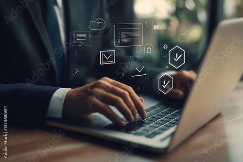 businessman, laptop, typing, datum, icon, overlay, virtual, cloud, graph, checkmark, business, information, communication, network, closeup, interface, finance, solution, marketing, management, success, strategy, investment, development, growth, efficiency, planning, innovation, connection, e-business, research, automation, progress, expertise, corporate, workflow, teamwork