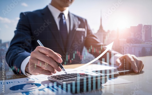 Businessman using a calculator to analyze financial data with a virtual graph showing growth and success in the city
