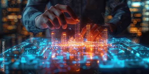 Businessman using holographic display to plan sustainable city, office environment, digital close-up photography