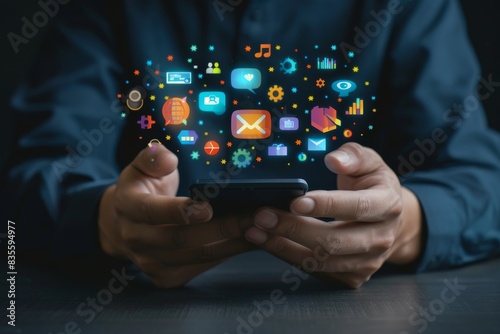 Businessman using mobile phone with digital marketing icons floating above, closeup on hands and device screen.