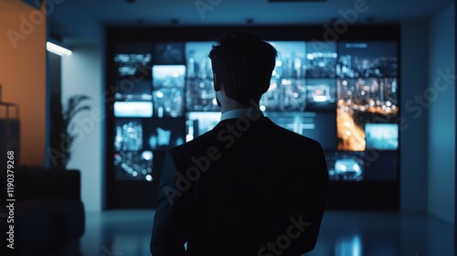businessman, man, suit, office, technology, datum, screen, wall, video, monitor, display, information, analysis, digital, modern, future, innovation, network, connection, global, earth, city, city landscape, graphic, chart, graph, dashboard, control, room, interior, dark, night, light, blue, back, view, person, professional, corporate, strategy, planning, research, development, success, growth, progress