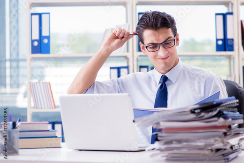 Businessman with excessive work paperwork working in office