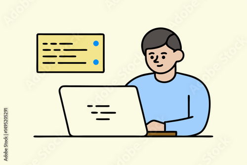 computer, laptop, business, businessman, cartoon, cyberspace, working, people, technology, office, person, work, vector, boy, illustration, sitting, man, smile, guy, notebook, smiling, student, web, men at work