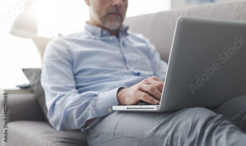computer, man, businessman, home, laptop, working, comfortable, connecting, cyberspace, communication, networking, living room, sofa, couch, wireless, adult, manager, tied-up, executive, white-collar, office worker, apartment, lying down, portable, relax, resting, sitting, technology, typing, lifestyle