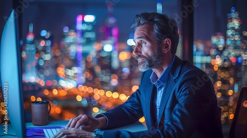 city lights, desk lamp, computer-screen, city view, corporate environment, night scene, city landscape