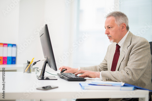 man, businessman, work, desktop, desk, job, computer, personal, cyberspace, program, software, accounting, business, accountant, online, banking, remote, service, office, interior, bright, light, white, search, searching, senior, old, mature, entrepreneur, employee, executive, manager, looking, monitor, app, application, web, website, company, corporate, people, person