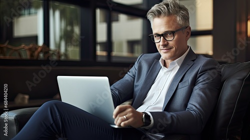 laptop, business, businessman, office, working, smiling, computer, work, sitting, lobby, notebook, desk, manager, technology, photogenic, people, men at work, looking, smile, cyberspace, professional, job, person, man, success, table