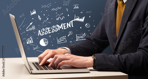 Businessman working on laptop with ASSESSMENT inscription, modern business concept