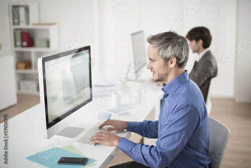 30s, american, business, businessperson, businessman, casual attire, caucasian, colleague, computer, desk, european, finance, finance, horizontal, indoor, keyboard, modern, office, office worker, people, person, to sit, team, teamwork, 30s, typing, white, workplace
