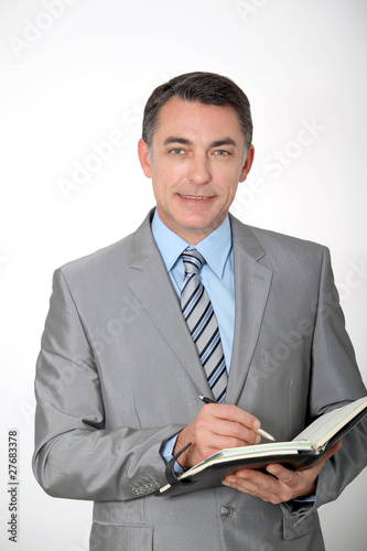 business, man, businessman, expression, attitude, agenda, appointment, book, booking, note, studio, white background, manager, boss, director, salesman, corporate, mature, men at work, suit, grey, caucasian, indoor