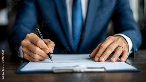 businessman’s hands holding a pen while writing on paper. The scene emphasizes attention to detail, professionalism, and commitment. Ideal for themes related to business, finance, and productivity