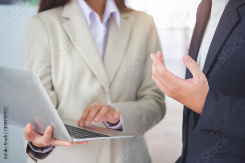 Businessmen and businesswomen chat with each other and use computers to check company budgets.