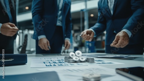 businessman, man, suit, office, table, desk, meeting, discussion, financial, datum, analysis, chart, graph, paper, document, coin, stack, money, dollar, currency, investment, success, profit, growth, strategy, planning, teamwork, collaboration, sharpened, serious, professional, business, finance, economy, wealth, corporate, future, deal, negotiation, opportunity, background, closeup, blurred, white, blue, silver
