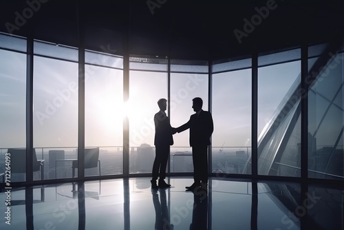 Businessmen in an office, shaking hands after deal completion, silhouette, business and technology concept