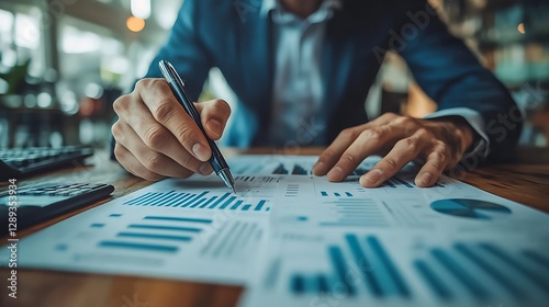 Businessperson analyzing financial data and charts with pen at a desk in a modern office